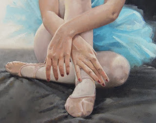Painting underway of dancer Robin V. I love the hands in this one and am trying to keep that as my focus. I'm also trying to match the beautiful baby blue color of my the actual outfit. I'm using W/N manganese blue and some ultramarine blue...along with permalba white. I see a lot of life and movement in this work even though the model is in a restful pose. 24x30.